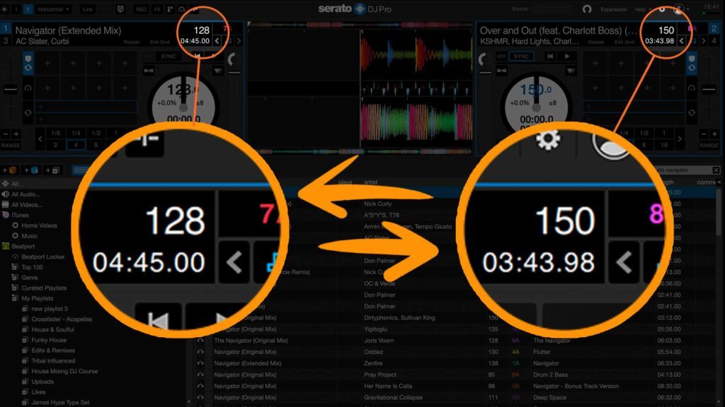 A big tempo adjustment is needed for the 22 BPM leap between the tracks. To achieve this, the tempo range in your DJ software must be set to accommodate this. In Serato, the default +/- 8% tempo range will only bring Over & Out down to 138 BPM at its lowest. Adjusting the range to be +/-16% allows it to match the native BPM of Navigator: 128 BPM.