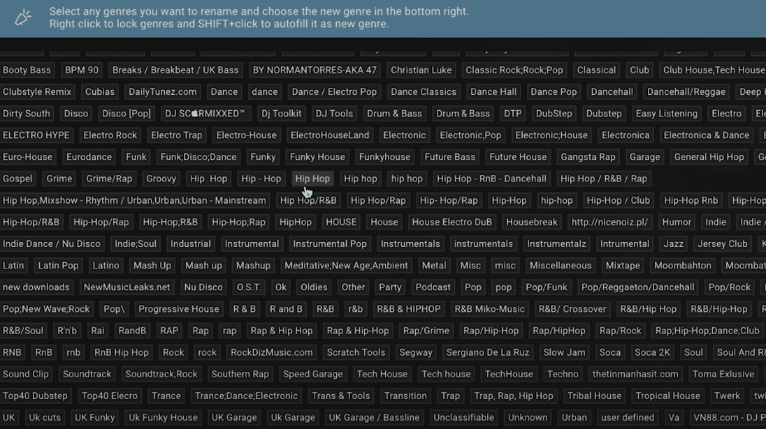 This will open up a page containing all of your genres. Here you can click on several at a time to streamline them. For example, if you have several variations of Hip Hop, like ‘Rap’, ‘hip hop rap’, ‘R&B rap’ etc. You can select all and regroup them as the same thing.