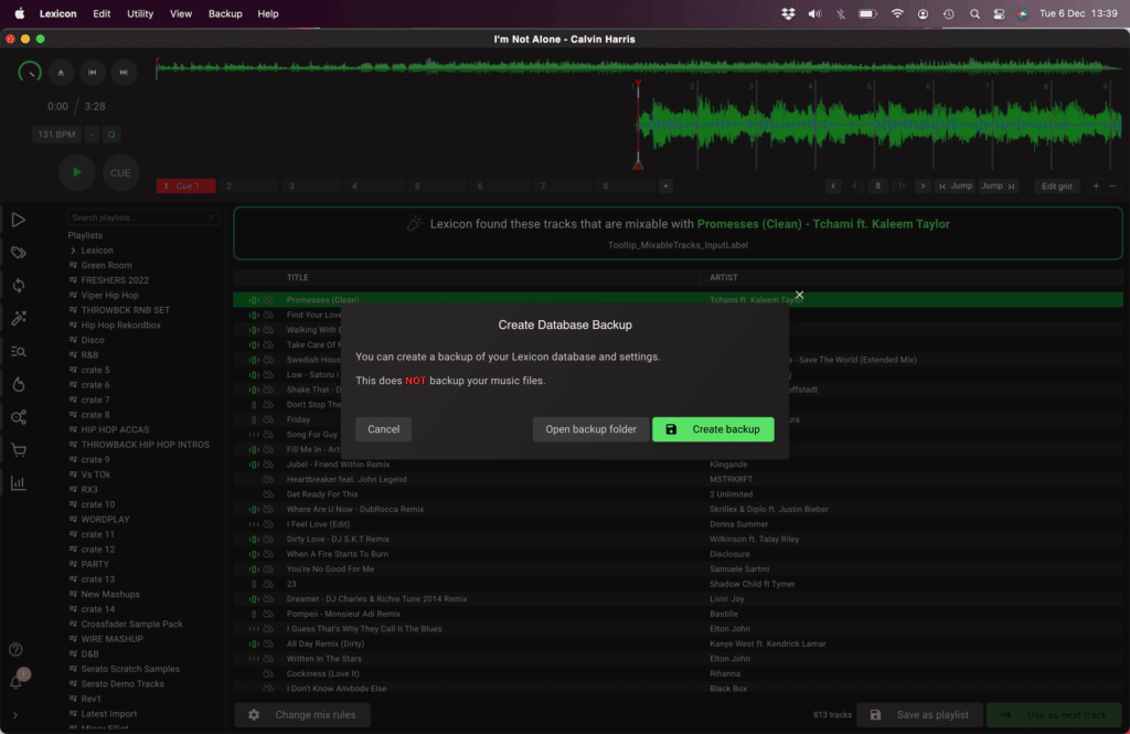 Before confirming, a check box to Create Backup is available to allow a data backup of the playlist before adding it to Lexicon. This is good practice as it will enable you to change your mind later.