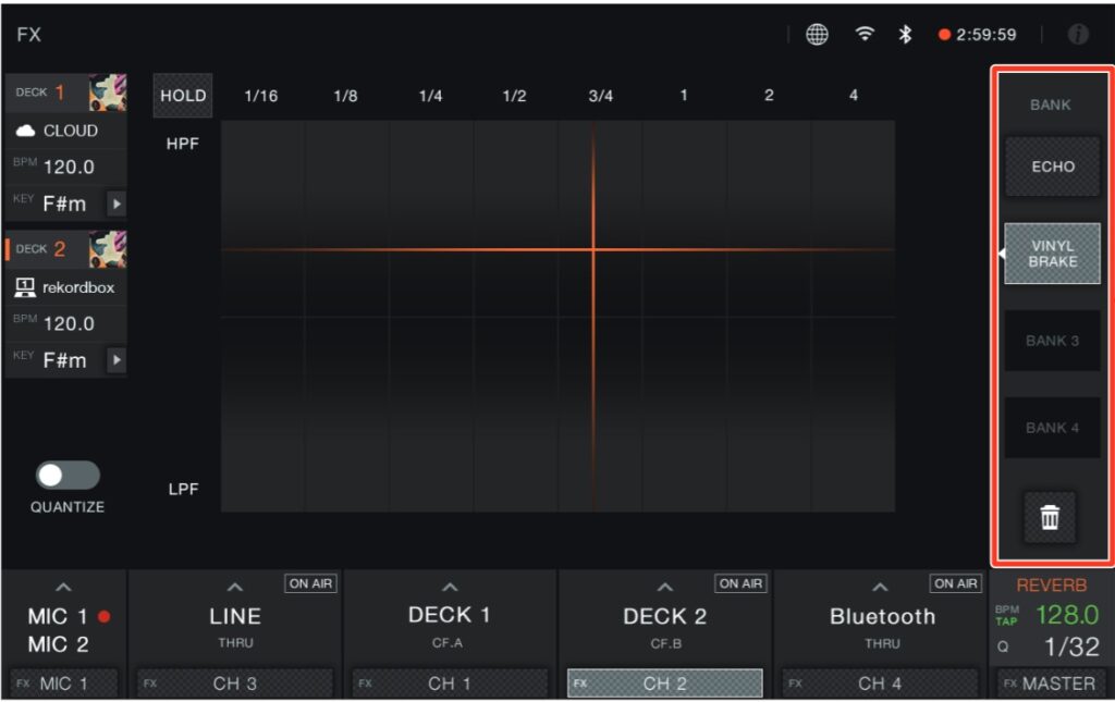 In typical Pioneer fashion, the beat effect controls are found on the right-hand side of the mixer, but some controls have been moved into the screen above.