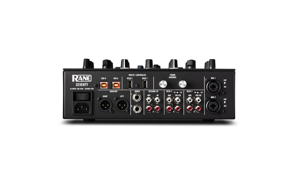 The Rane Seventy is a mixer built around the use of Serato DJ software. It’s no surprise then to find two USB B inputs on the rear of the device for seamless back to back DJ’ing. The seventy also features two USB A ports for the connection of the Rane Twelve controllers. The mixer features 2 channels, with switchable phono/line level RCA inputs and line level auxiliary inputs.