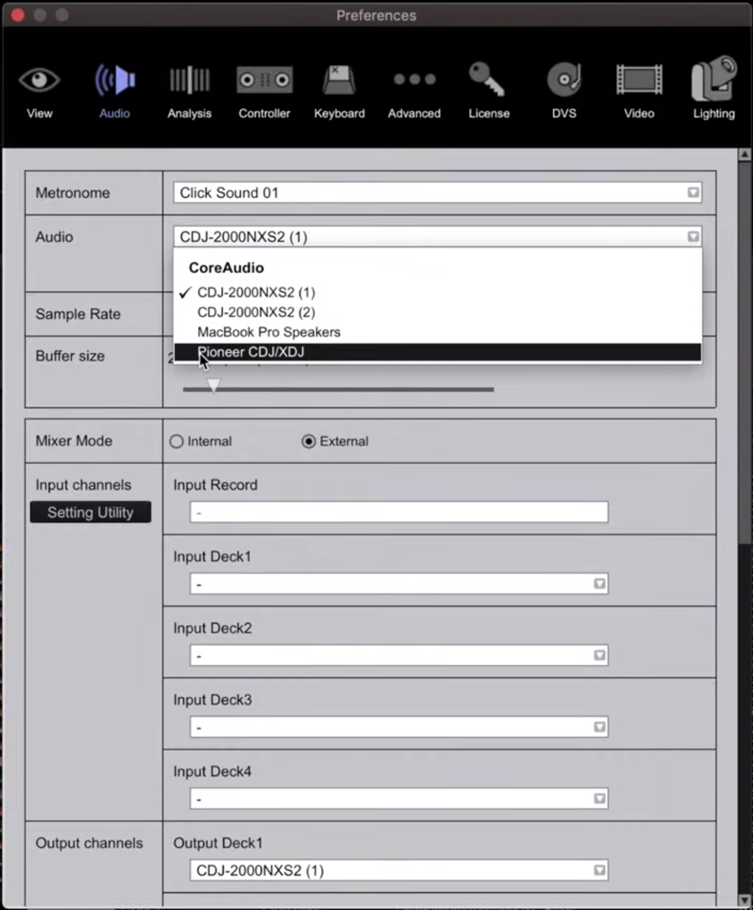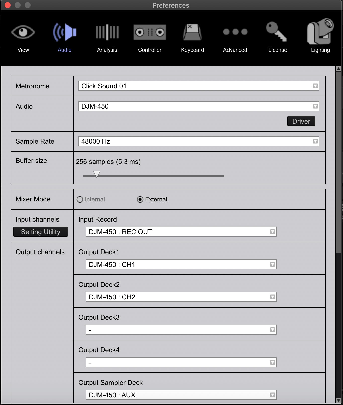 When you have your drivers installed, head into Rekordbox and open the preference panel. Click on the Audio tab and make sure your audio settings are routed to the mixer and not the CDJ’s or internal laptop speakers. You can change which deck comes out of which channel but in our example below, we have the default setting for a Pioneer DJ DJM 450.
